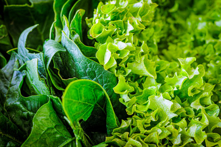 Close-up of fresh spinach and curly lettuce leaves. Vibrant green textures highlight the organic and healthy food concept. Perfect for diet, nutrition, and vegetarian themes