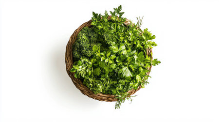 A stunning collection of fresh green vegetables and herbs displayed on a white background, perfect for promoting healthy eating and culinary creativity in food photography.