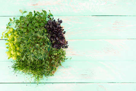 Micro greens of radish, onion, sunflower and basil on an old wooden vintage table. Healthy, organic food. Growing microgreens at home.