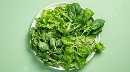 A composition of green leafy vegetables (spinach, lettuce, arugula) arranged on a white plate generative ai
