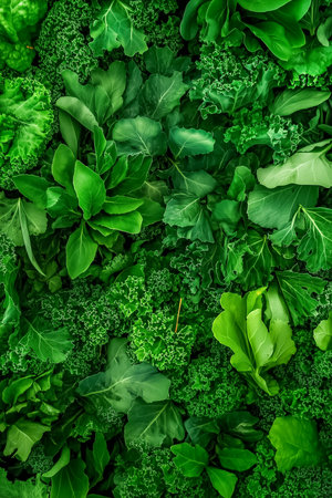 A vibrant mix of fresh green leafy vegetables, including kale, spinach, and broccoli. Perfect for healthy cooking and nutritious meals. Ideal for food lovers.