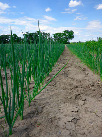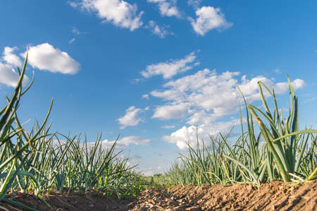 View of a field with ripening green onions. onion field. Onion ripe plants growing in the field, close-up. Field onion ripening in spring. agricultural landscape. growing green