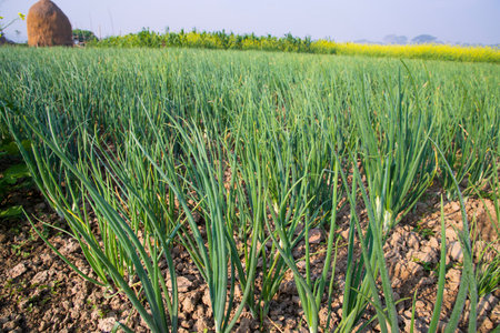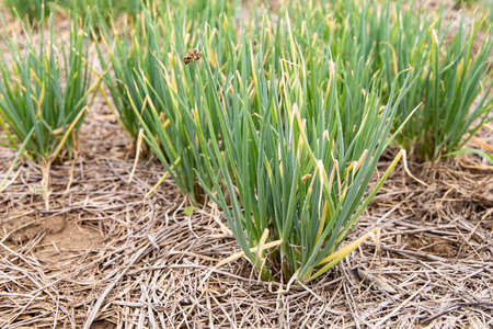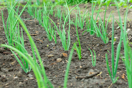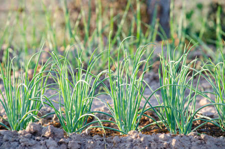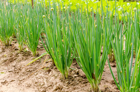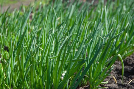 Onions growing in the garden. Onion plantation.