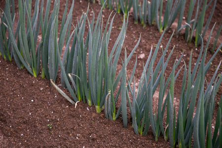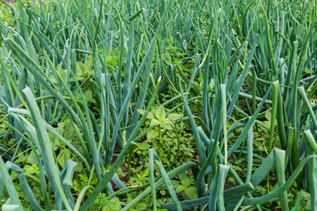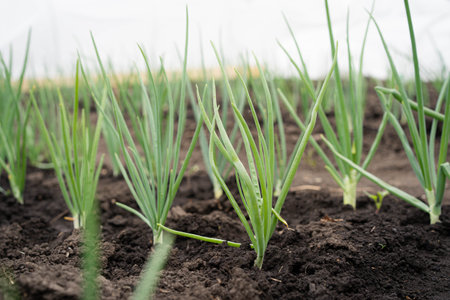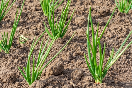 close-up of growing onion plantation in the vegetable garden