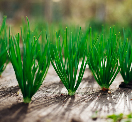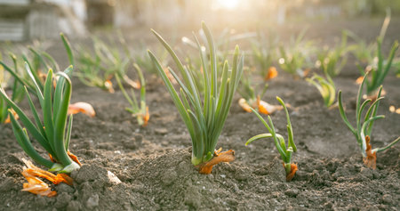 Planted onions with green stems against the background of the sun's rays. Picture for a gardening shop, advertisement for seedlings, books about plant care.