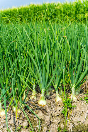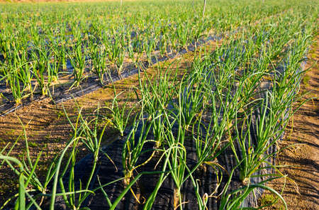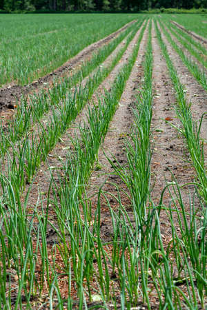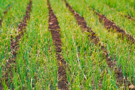 Onions are grown on soil in plots. Rows on the field in the agricultural garden. landscape in summer. Onion plants grow on the field, close-up. Onion production field, cultivation