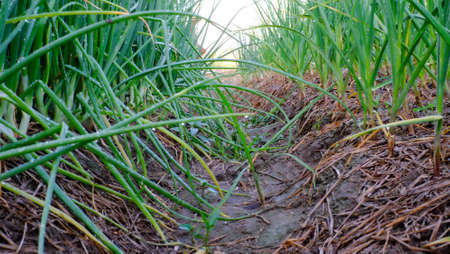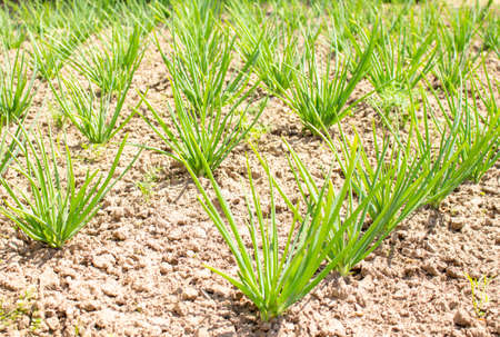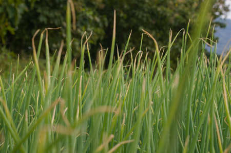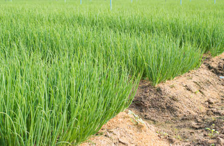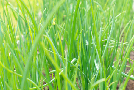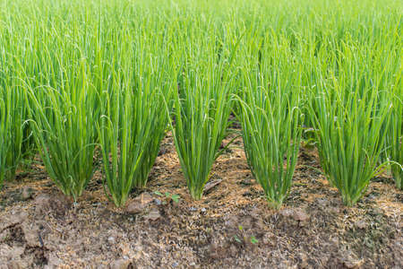 Close-up of growing green onion plantation in the vegetable garden agriculture in the countryside , Healthy food concept.