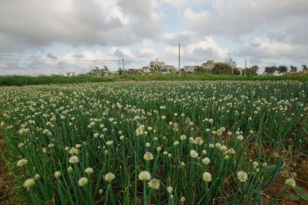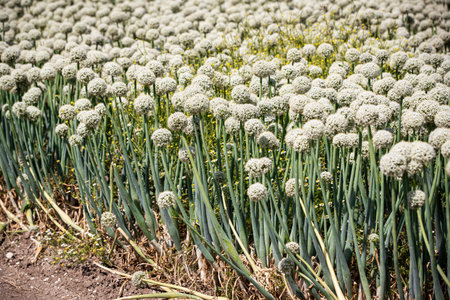 Field of onion plants in bloom, closeup of green onions.