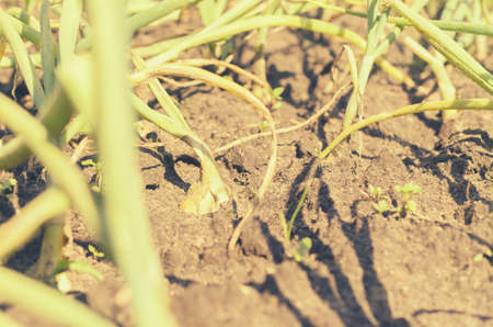 Growing garlic in field, copy space. Farm vegetable. Small sapling of garlic plant. Garlic plantation. The germs of garlic in the garden, toned