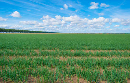 Vegetables in an agricultural field in the countryside below a blue cloudy sky in sunlight in summer, Almere, Flevoland, The Netherlands, July 22, 2020