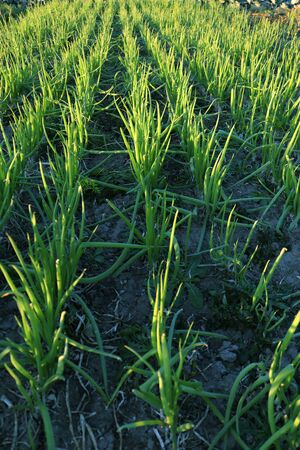 The onion beds on chernozem. Green onion shoots at sunset. Green sprouts on the ground.