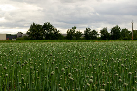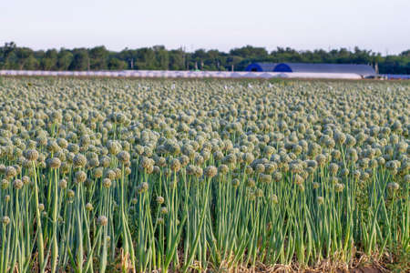 A field planted with onions with warehouses in the background. Green leaves of onion with flowers.