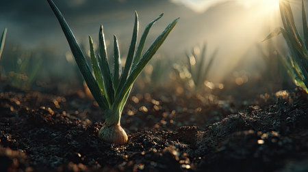 A cinematic wide shot of a young Onion growing, slightly larger than before, surrounded by rich, dark soil and faint morning mist, golden sunlight breaking through the clouds, soft beams illuminating the growing plant, ultra-realistic photography with true Earth like realism natural hues, no artificial colors, cinematic composition, deep 3D parallax depth creating an immersive, awe inspiring atmosphere, subtle natural lens flares, minimal 35mm film grain, tranquil and hopeful tone, 8K, highly detailed.