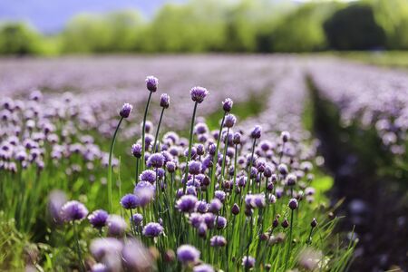 Blooming chive herbs on a field. Agriculture field in the blurry background.