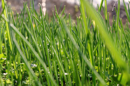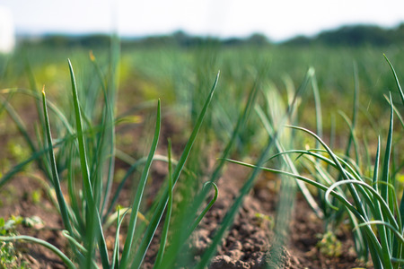 Young green onions in the field on a sunny day