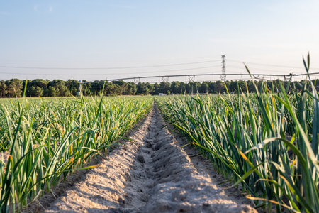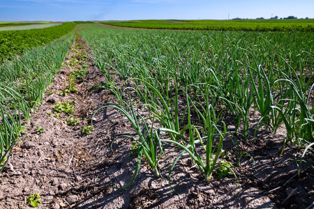 Green onion field, rows of onion at farm growing in summer time.