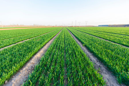 Green Onion plantation in the field of winter morning view