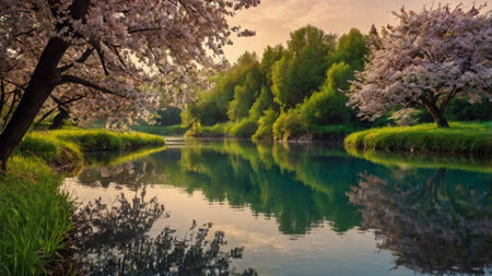 cherry blossom on the river bank, spring landscape with flowers