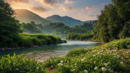 Beautiful summer landscape with mountain river and green meadow at sunset