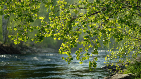 The River birch in spring, fresh green leaves, soft sunlight filtering, vibrant atmosphere full of vitality, natural textures, serene mood.