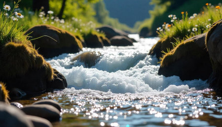 A close-up view of a tranquil stream flowing through a lush forest. The water is crystal clear and the rocks are covered in moss. The yellow flowers on the banks add a splash of color to the scene.