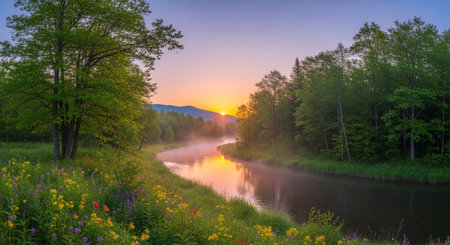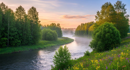 Sunrise Over River Scene With Mist and Wildflowers