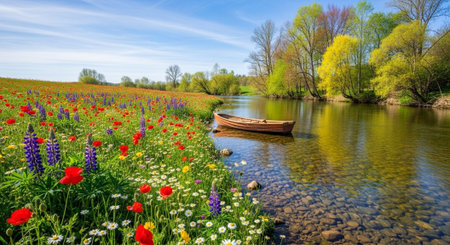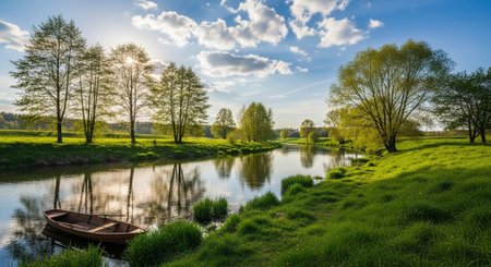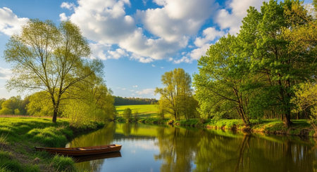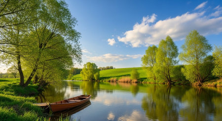 Beautiful spring landscape with a small boat on the river and blue sky