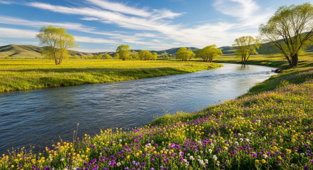 Beautiful spring landscape with river and flowers. Panoramic view