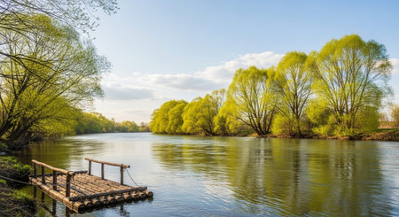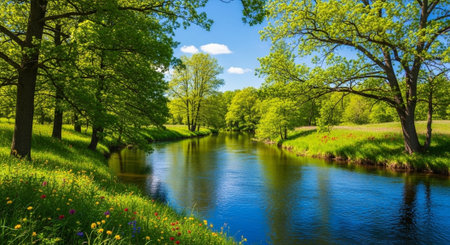 Beautiful spring landscape with a river and green trees on a sunny day