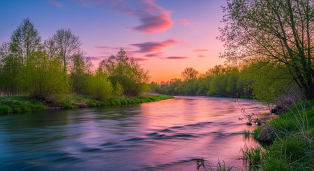 Sunset over a small river in the countryside. Landscape.