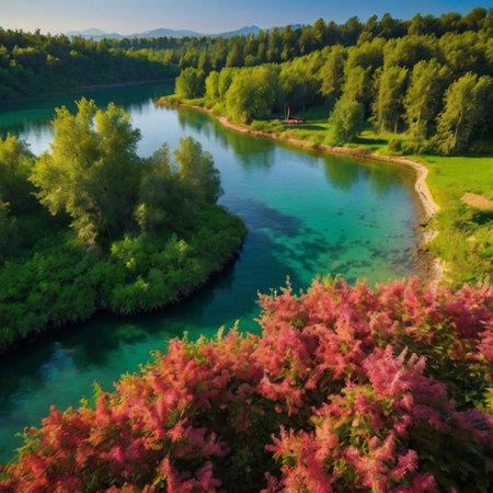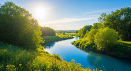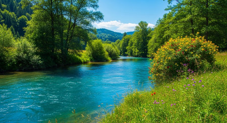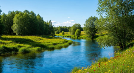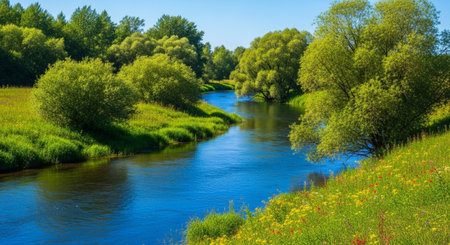 Crystal clear river flowing through a vibrant green landscape
