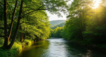 River flowing through the forest in the morning. Beautiful nature background.