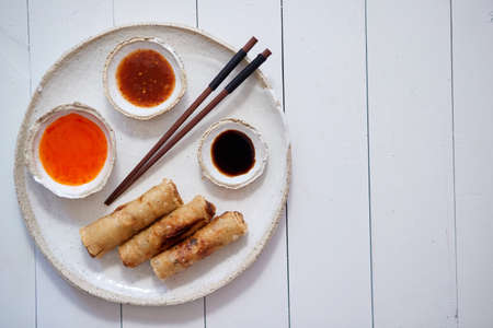 Healthy vietnamese spring rolls as portion stuff vegetable on ceramic plate serve with spicy sauce. Top view, Selective focus.