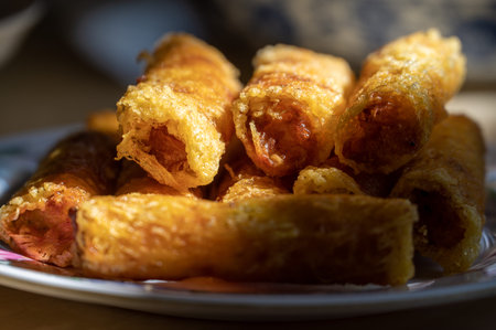 fried spring roll rice paper vegetables shrimp quick snack asia thailand malaysia full plate close-up