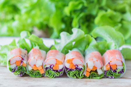 Salad rolls, made from vegetables and flour salad dressing in box container placed on wood table