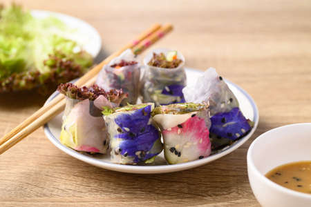 Fresh spring roll with edible flower and vegetable, Vegan food