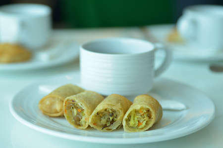 Fried spring rolls or popia or lumpia in white plate