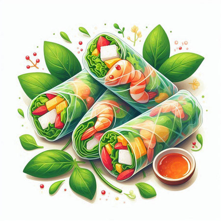 Vector illustration of spring rolls with shrimps, vegetables and sauce