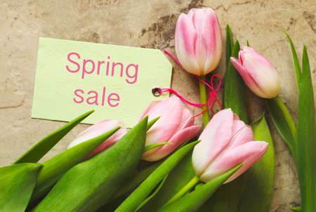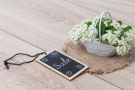 Tag with the inscription Spring Sale on a background of spring flowers with space for text