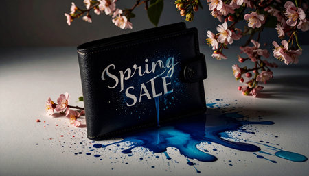 Spring Sale text, stylized with paint splatter design. Abstract, colourful paint splashes, including vibrant reds, pinks, blues, and greens, are meticulously applied to the leather surface, forming abstract leaf like patterns.