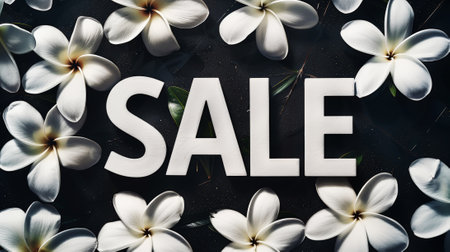 SALE sign in white letters surrounded by white flowers in boho style. Dark background. Adv concept. Generative AI.