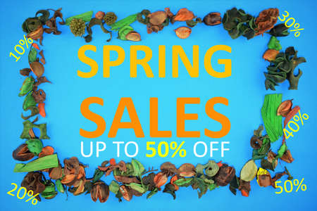 Spring sale up to fifty percent, blue background with decorative dry leaves forming a frame
