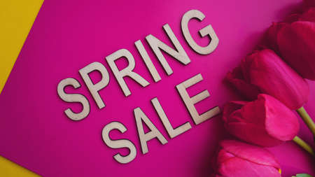 The inscription Spring Sale surrounded by spring flowers. Spring equinox