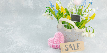 Spring sale concept. Shopping bag with traditional flowers and handmade heart. Greeting card, surprise or gift concept. Pastel design, light background, banner format