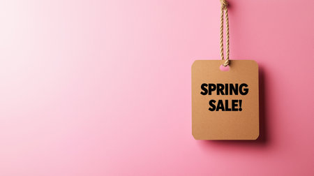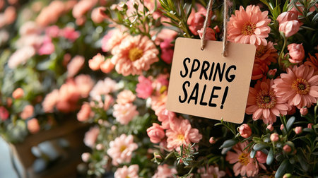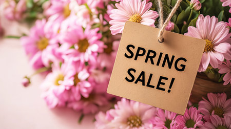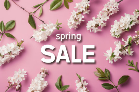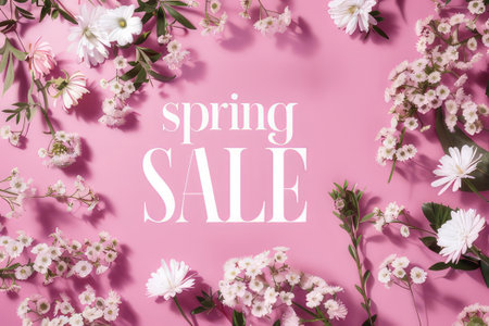 The design features a vibrant pink background adorned with beautiful white flowers alongside the enticing words spring sale AI-generated content.