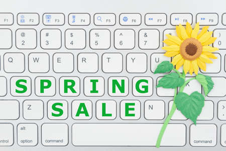 Spring sale shopping message with a keyboard and a yellow daisy flower