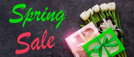 Spring Sale sign text header for blog website. White tulip flowers and colorful gift boxes with ribbon bows on black background flat lay. Flower Bouquet greeting card. Template shopping offer banner