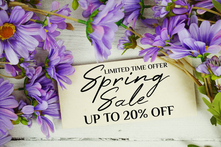Spring Sale 20% Promotion and Marketing with flowers bouquet decoration on wooden background