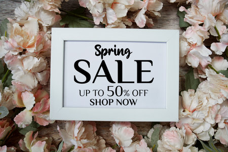 Spring Sale 50% Promotion and Marketing with flowers bouquet decoration on wooden background