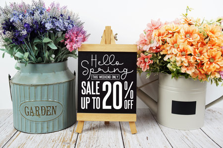 Spring Sale 20% Promotion and Marketing with easel with flowers bouquet decoration